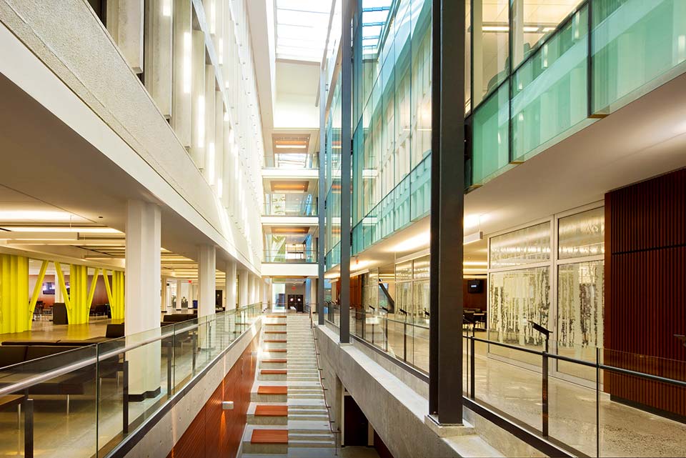 • A large-scale central foyer surrounding the atrium, the hall is a welcoming light-filled environment equipped with substantial lounge space and offering extensive room for student and public gatherings.
