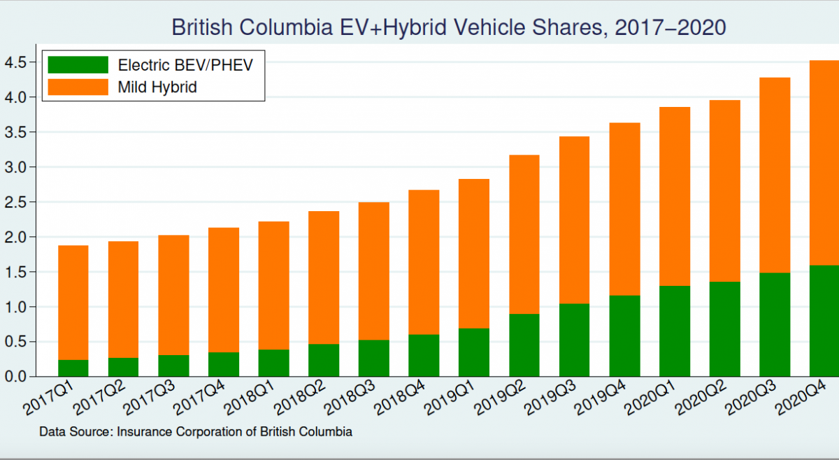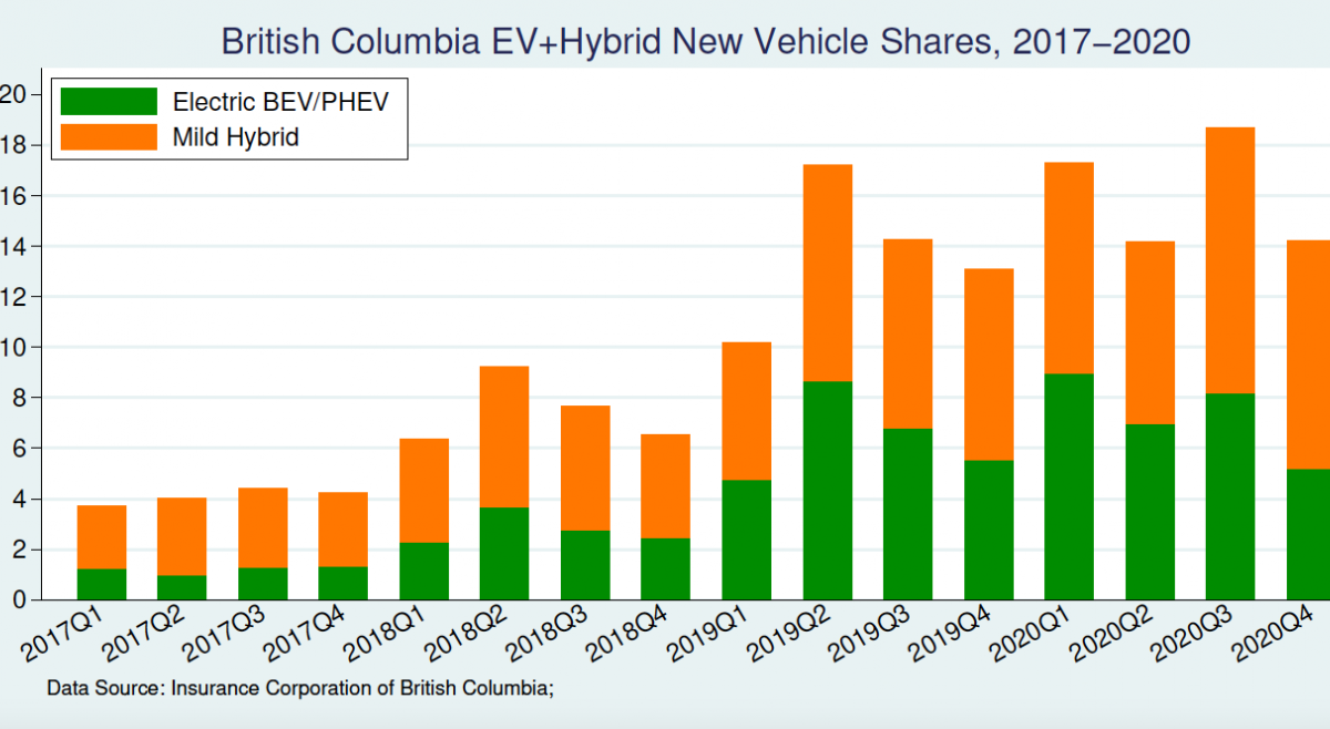 British Columbians take pride in being environmental leaders. One way this is manifesting itself is the relative speed with which drivers are embracing electric vehicles (EVs). While Norway is a global leader (more than half of all new cars in the country are electric), B.C. is making strides ahead of other jurisdictions in Canada as well as other jurisdictions in North America (ICCT 2020).